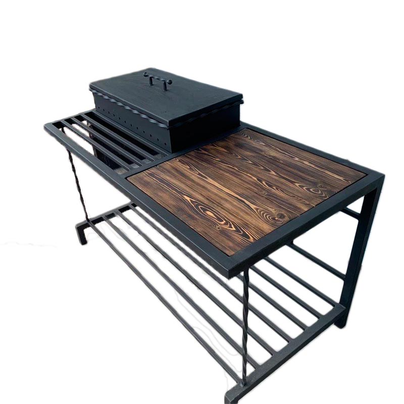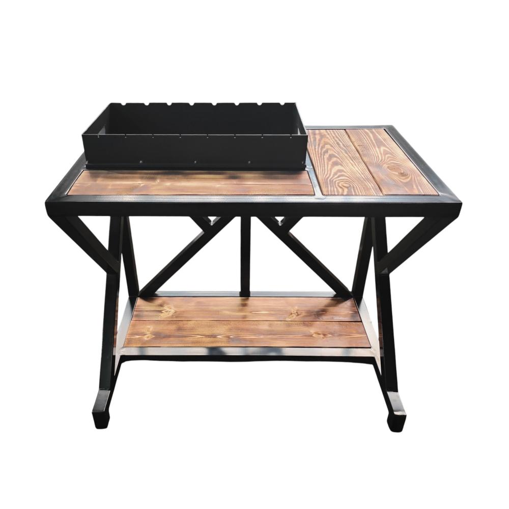 Функциональная и комфортная конструкция, крыша и элементы ковки и резьбы мангала имеют гармоничный вид. Данное изделие выражает вашу индивидуальность, подчеркивает оригинальный стиль и практически всегда становится центральным декоративным элементом садового участка. Элементы ковки, резное панно делают каждую конструкцию эксклюзивной. Эта особенность позволяет сделать мангал достойным подарком ценителям загородного отдыха. Мангал изготовлен из стали 3 мм, покрыт порошковой краской, которая защитит элементы от нежелательной коррозии. В чаше есть место для установки казана, а также труба дымохода. Рядом с чашей мангала предусмотрено место для размещения необходимых в готовке вещей, а под ней- место для укладки запаса дров. Кровля сделана трёхэлементной (из листового металла), что позволяет горячему воздуху подниматься вверх и не скапливаться под крышей, а Вам обеспечивает более комфортное приготовление блюд.